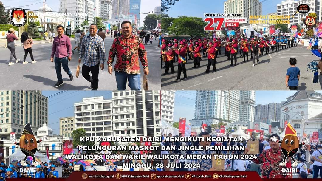 Dairi (KPN) – Komisi Pemilihan Umum (KPU) Kabupaten Dairi turut berpartisipasi dalam acara peluncuran maskot dan jingle Pemilihan Walikota dan Wakil Walikota Medan 2024 yang digelar pada Minggu, 28 Juli 2024. Kegiatan ini berlangsung meriah di Pelataran Kantor Pos, Area Car Free Day Kota Medan, Jalan Bukit Barisan.