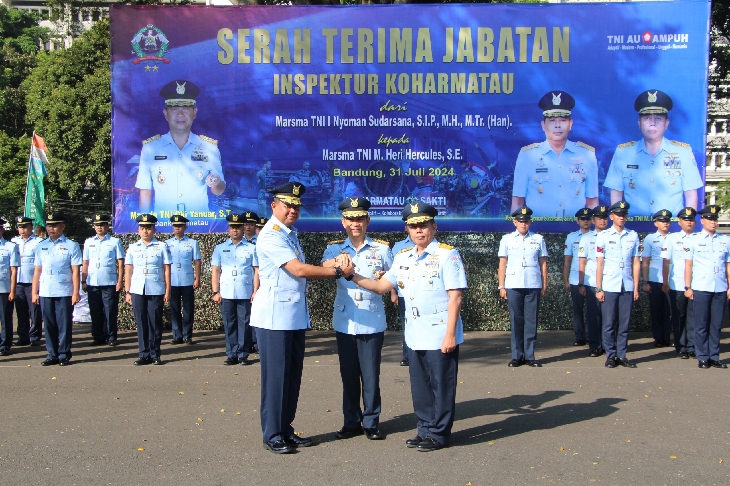 Bandung (KPN) – Komandan Komando Pemeliharaan Materiel TNI AU (Dankoharmatau), Marsda TNI Oki Yanuar, S.T., memimpin acara serah terima jabatan Inspektur Koharmatau dari Marsekal Pertama TNI I Nyoman Sudarsana, S.I.P., M.H., M.Tr.(Han) kepada penggantinya Marsekal Pertama TNI M. Heri Hercules, S.E. Upacara tersebut berlangsung di Lapangan Upacara Koharmatau, Bandung, Rabu (31/07/2024).