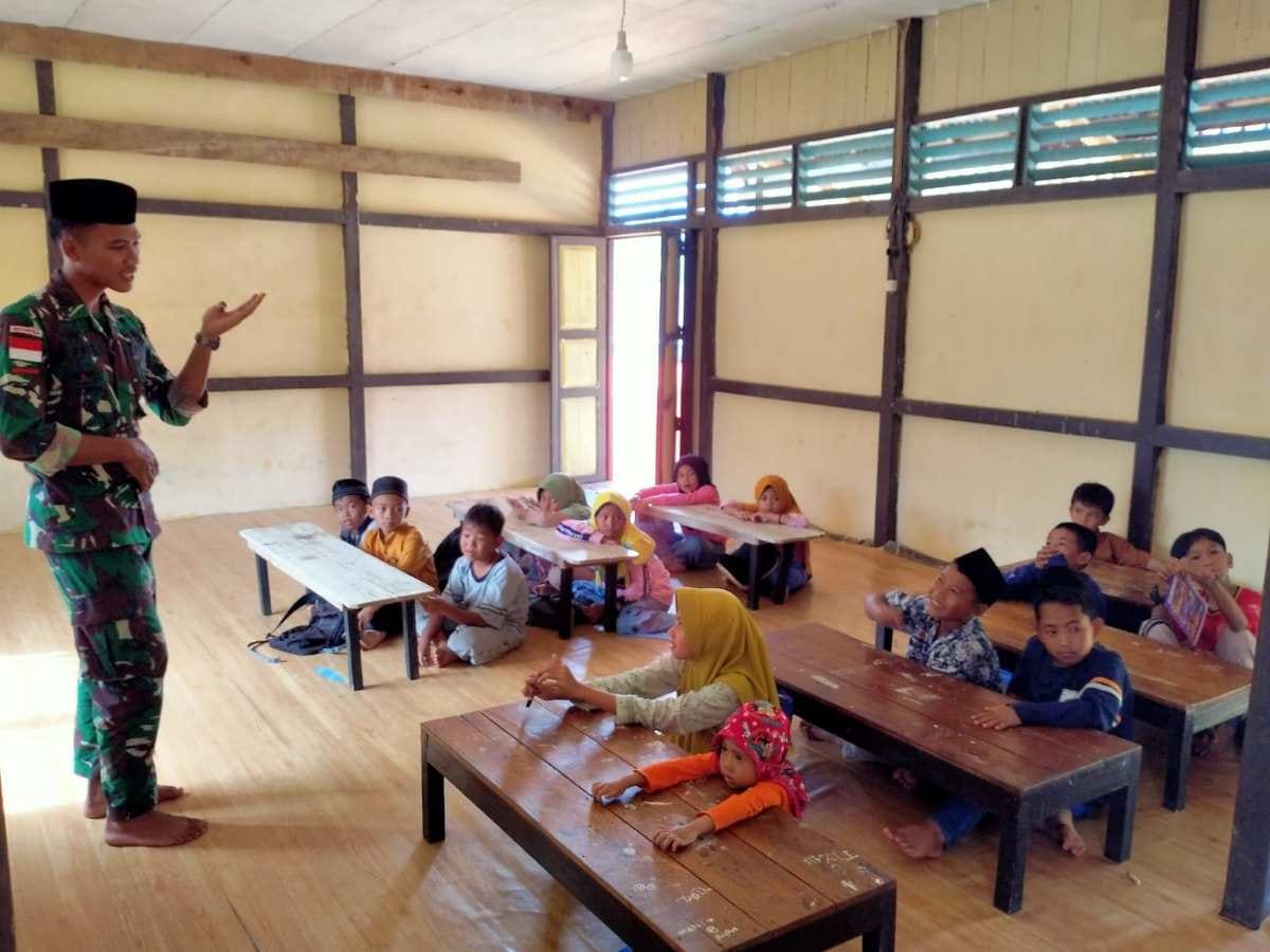 Sintang – Membentuk pondasi Iman sejak dini, Satgas Pamtas RI-Malaysia Yonzipur 5/ABW Pos Kout (Komandan Utama) Mengajar TPA (Taman Pendidikan Al-Qur’an) kepada anak-anak yang masih berusia 10 tahun ke bawah di desa Ketungau hulu, Kecamatan Snaning, Kabupaten Sintang. Kamis, (1/8/2024).