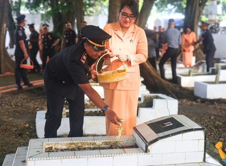 Selepas upacara, Karutan Pangkalan Brandan, Bapak Agung Joni beserta Ketua DWP, Ny. Ayu Agung Joni, seluruh pejabat serta seluruh jajaran pegawai menuju makam untuk melakukan tabur bunga.(AVID/rel)