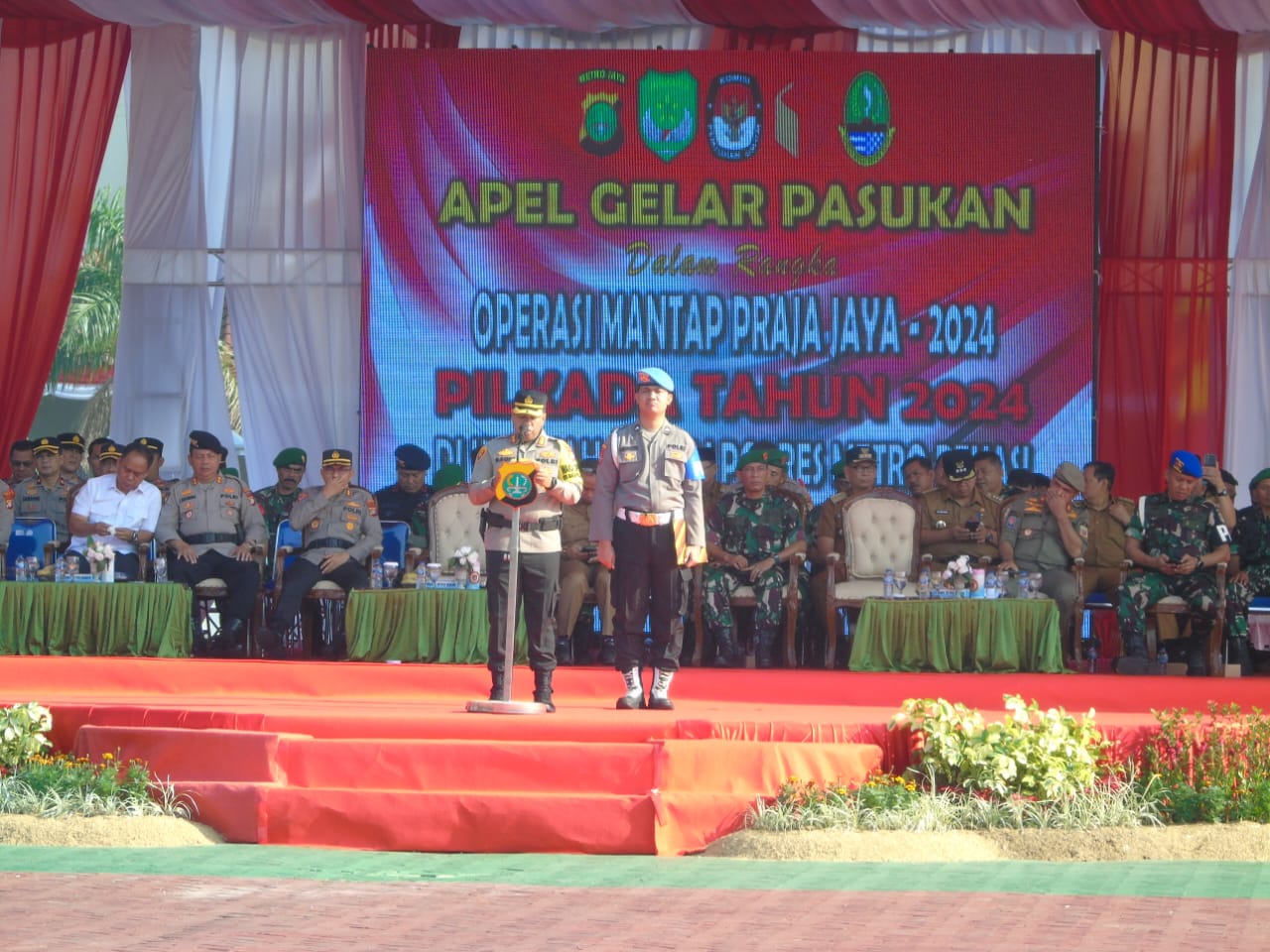 Apel gelar pasukan ini juga dihadiri oleh Wakapolres Metro Bekasi, AKBP Saufi Salamun, S.I.K., yang mewakili Kapolres Metro Bekasi. Dalam sambutannya, AKBP Saufi menyampaikan amanat Kapolda Metro Jaya terkait Operasi Mantap Jaya yang akan berlangsung di wilayah Polda Metro Jaya sepanjang Pemilukada 2024.