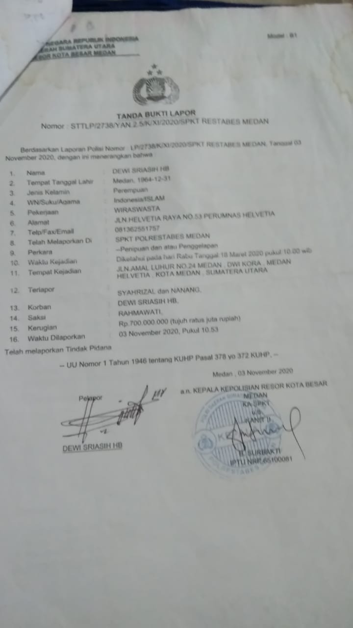 Kepada awak media, Minggu (25/08/2024), Ibu Dewi mengungkapkan, kasus ini bermula ketika dirinya melaporkan kejadian penipuan dan penggelapan yang diduga dilakukan oleh Syahrizal dan Nanang.