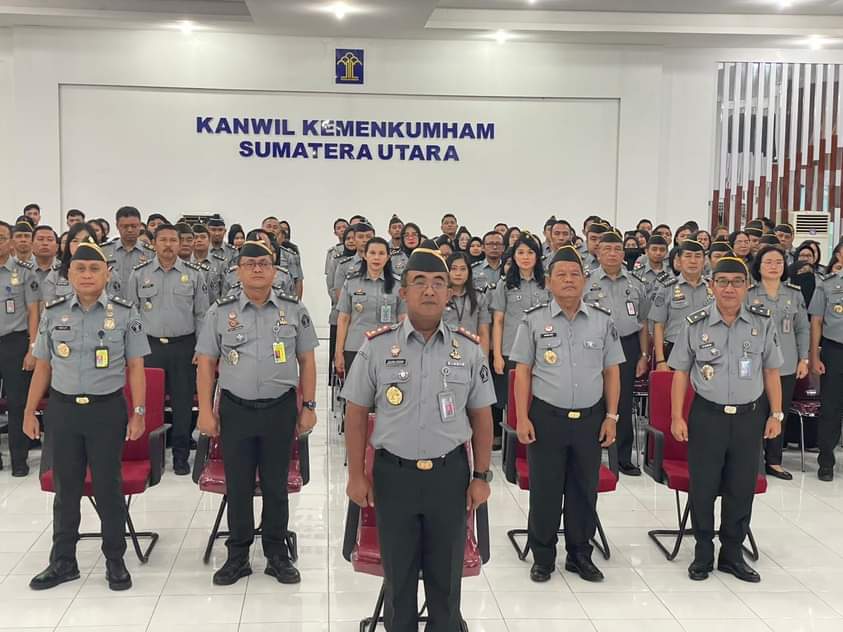 Jajaran Kantor Wilayah Kementerian Hukum dan HAM Sumatera Utara mengikuti kegiatan ini secara virtual dari Aula Soepomo melalui Zoom Meeting. Turut hadir Kepala Kanwil Kemenkumham Sumut Anak Agung Gde Krisna, para Kepala Divisi dan seluruh pegawai.
