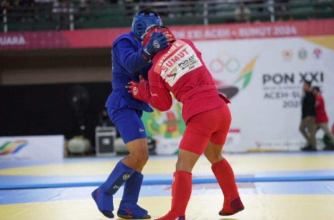 Atlet sambo kontingen Sumatera Utara kelas Men Combat 65 Kg, Everaim Ginting berhasil meraih medali emas usai mengalahkan lawannya Gugun Gusman dari Jawa Barat dengan TKO.