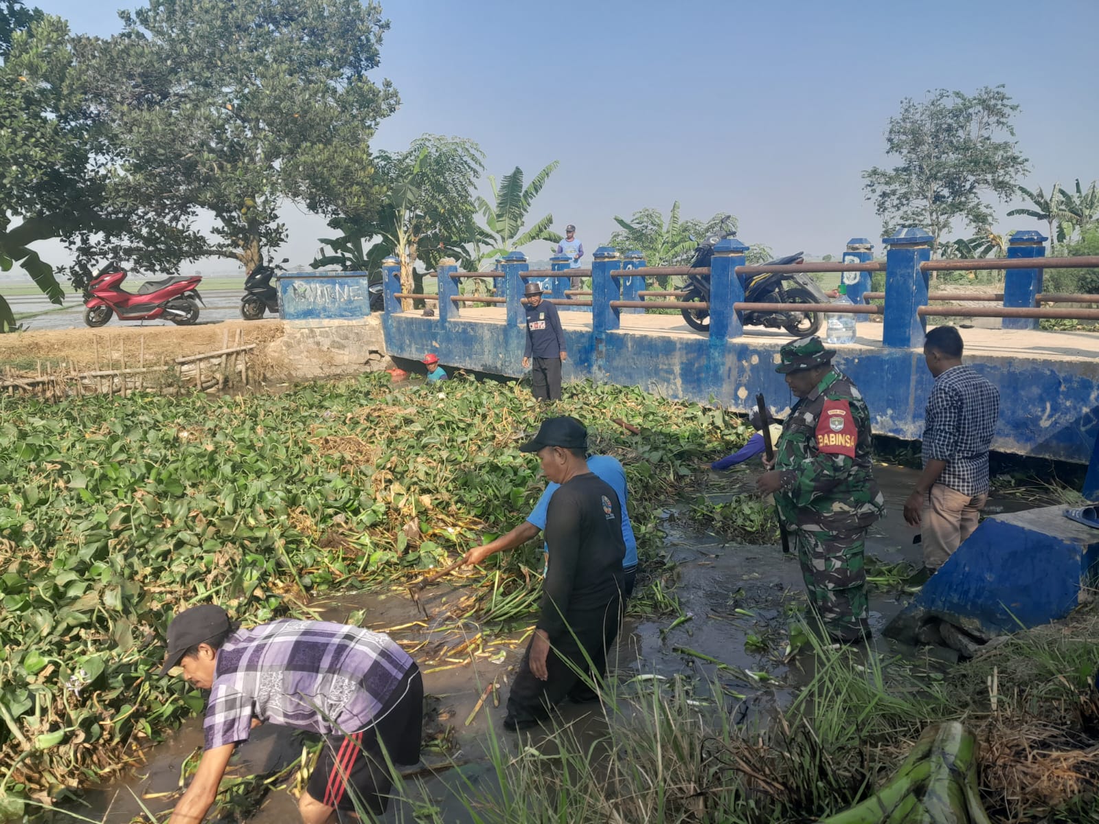 Bekasi Pebayuran – akibat menghambat produktivitas pertanian, Babinsa Serda Surata dari Koramil 11 Pebayuran bersama warga Desa Sumberreja melaksanakan gotong royong membersihkan enceng gondok yang menutupi saluran irigasi BKG 28 di Kampung Cecendet RT 03/RW 02, Kecamatan Pebayuran, Kabupaten Bekasi, pada Selasa (24/9/2024).