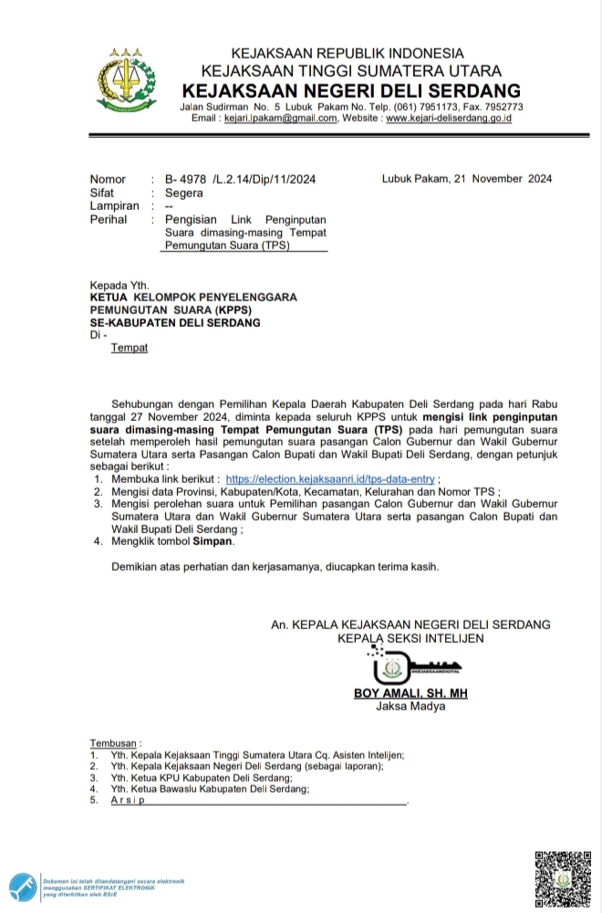 Permintaan kejaksaan itu melalui surat resmi kepada KPPS se Sumatera Utara dengan tembusan KPU, serta mencantumkan link yang mereka buat, yaitu https://election.kejaksaanri.id/tps-data-entry untuk segera dilakukan.