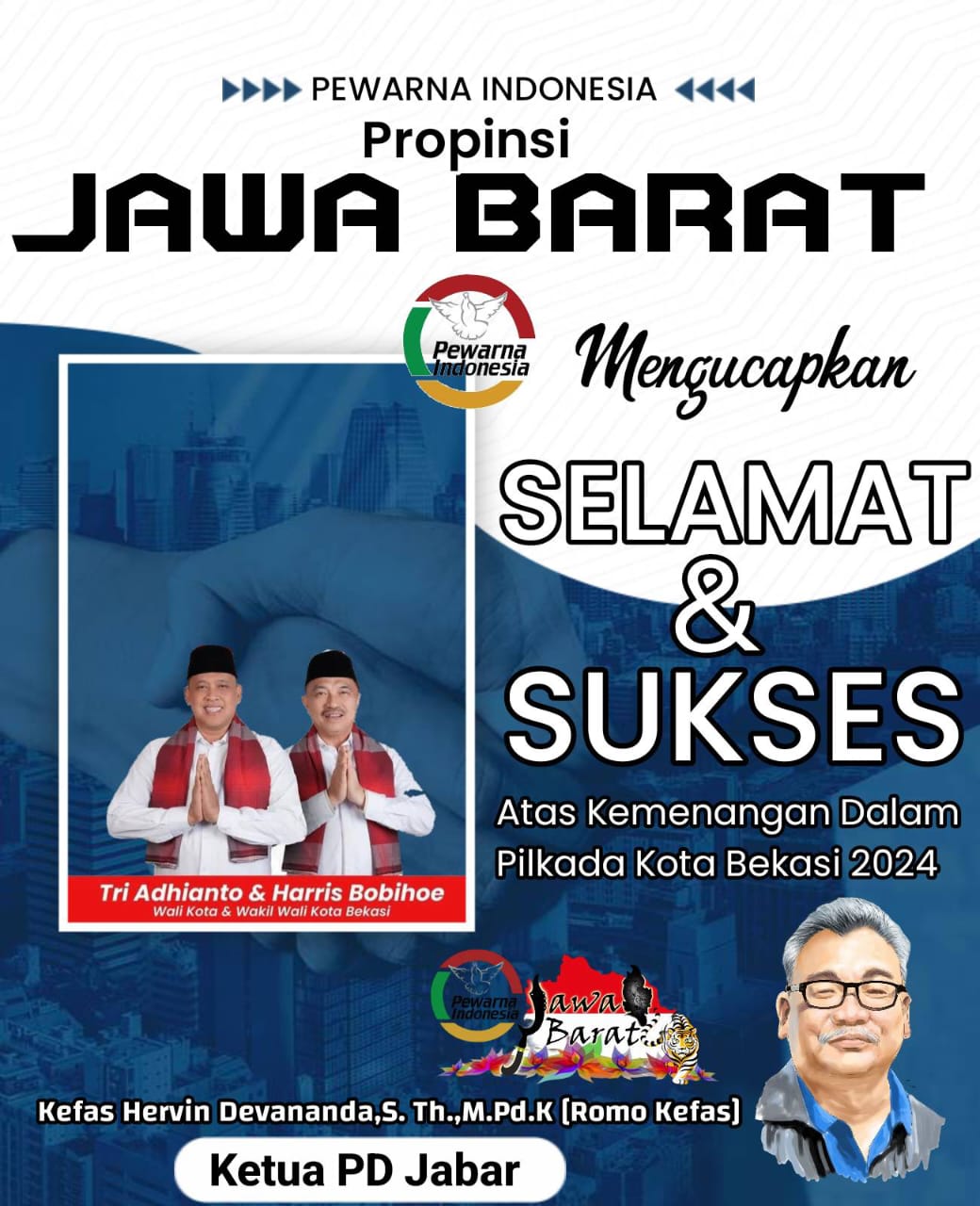 Dalam kesempatan tersebut Ketua Pewarna Indonesia Propinsi Jabar Kefas Hervin Devananda.S.Th, M.PdK mengatakan Puji syukur kepada Tuhan bahwa pasangan Tri – Harris berhasil memenangi Pilkada kota Bekasi dengan perolehan 459.430 suara,ujar Pria yang disapa Romo Kefas saat diwawancara oleh awak media di RM Sudirman Galaxi Bekasi,Senen malam [02/11/2024]