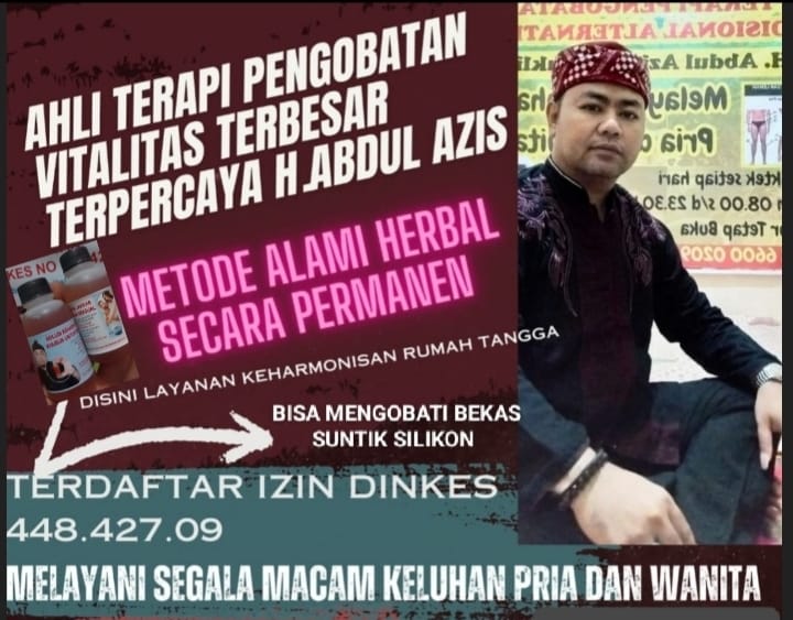 Pengobatan ini paling ampuh, paten, terjamin, berpengalaman ditangani langsung oleh pakarnya, yaitu, H. Abdul Azis sudah terkenal sebagai ahli terapi kejantanan pria yang professional dalam menangani keluhan pria dan Wanita.