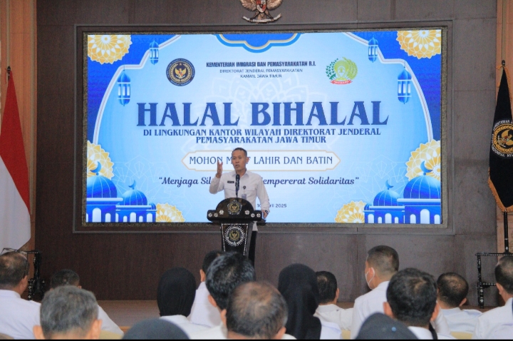 Surabaya – Plt Kepala Rutan Bangil, Muhammad Faishol Nur, turut hadir dalam kegiatan Halalbihalal Kepala Unit Pelaksana Teknis (Ka. UPT) Pemasyarakatan di lingkungan Direktorat Jenderal Pemasyarakatan Jawa Timur. Kegiatan yang dilangsungkan pada Kamis pagi (10/4) pukul 09.00 WIB ini bertempat di Aula Raden Wijaya Kanwil Kementerian Hukum Jawa Timur dan dihadiri oleh seluruh Ka. UPT Pemasyarakatan se-Jawa Timur serta jajaran pejabat struktural Kantor Wilayah.