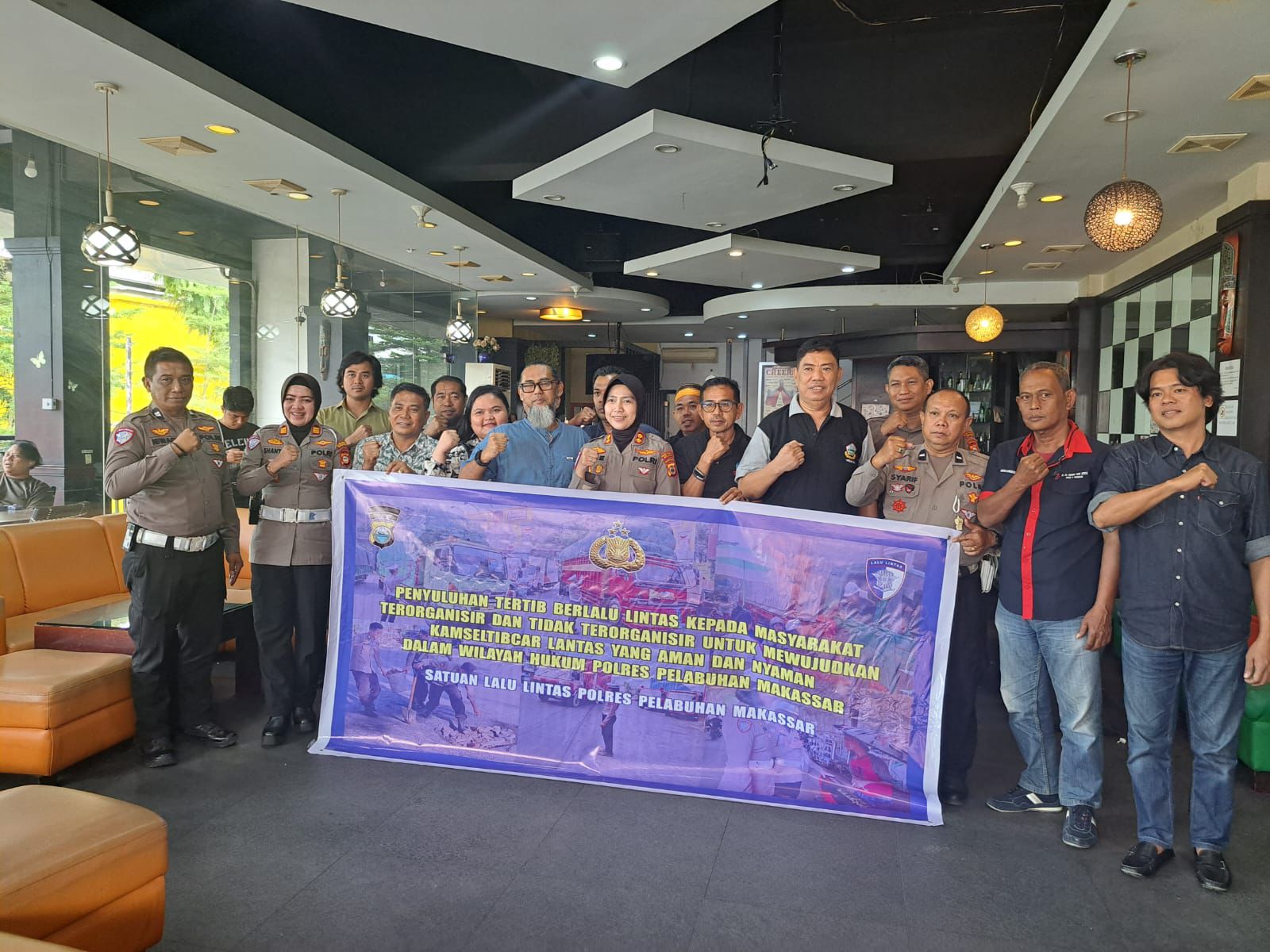 HUMDER — Polres Pelabuhan Makassar kembali menunjukkan komitmennya dalam menciptakan keamanan, keselamatan, ketertiban, dan kelancaran lalu lintas (Kamseltibcar Lantas) di wilayah hukumnya. Bertempat di Lantai 2 Café Pelangi, Jalan Bontolempangan, Kamis (8/5/2025), Kapolres Pelabuhan Makassar AKBP Rise Sandiyantanti memimpin langsung kegiatan penyuluhan tertib berlalu lintas kepada masyarakat dan para pelaku usaha jasa angkutan kontainer.