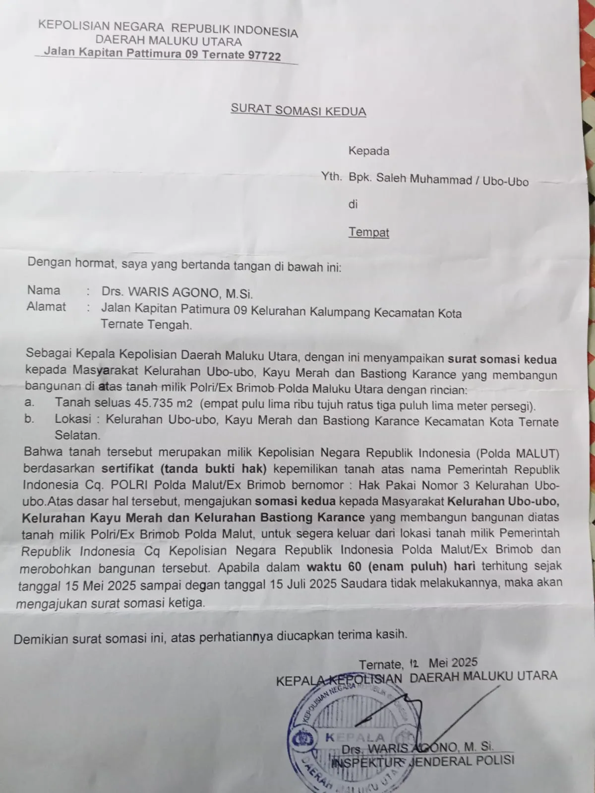 Ternate – Surat somasi kedua yang dilayangkan Kapolda Maluku Utara terhadap warga di tiga kelurahan (Ubo-ubo, Kayu Merah, dan Bastiong Karance) terkait sengketa tanah seluas 45.735 m² memantik kritik tajam dari praktisi hukum. Surat bernomor Hak Pakai 3 Kelurahan Ubo-ubo itu dinilai bermasalah secara hukum, terutama karena salah satu pihak yang disomasi, Saleh Muhammad, dilaporkan telah meninggal dunia beberapa tahun lalu.