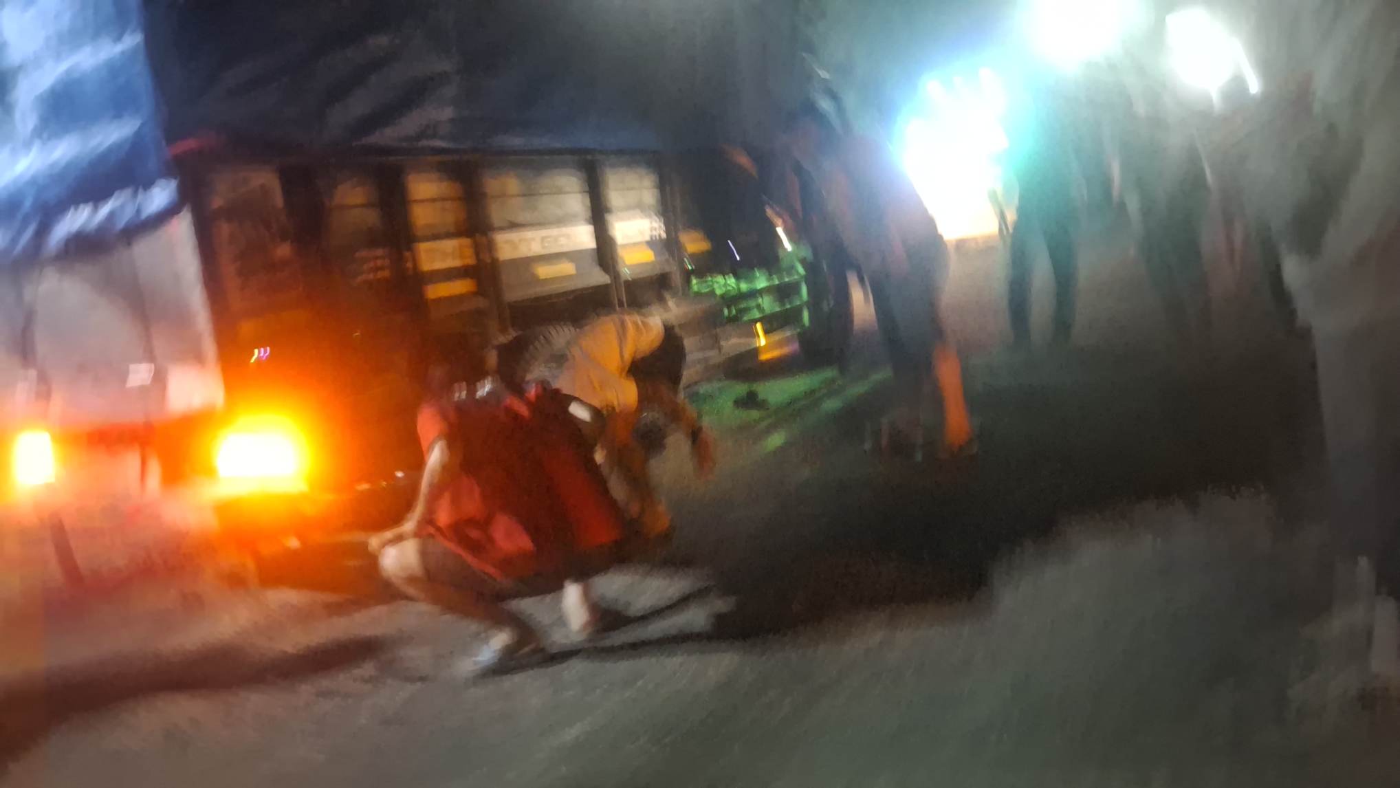 Sementara truk bernomor polisi B 9699 FDD terlihat berhenti di lokasi kejadian dengan lampu belakang menyala.